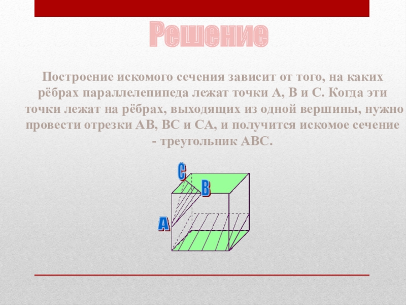 точки A, B и C. Когда эти точки лежат на рёбрах, выходящих из одной вершины, нужно провести отрезки AB, BC и CA, и получится искомое сечение - треугольник ABC.