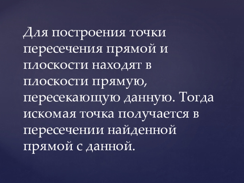 Для построения такой точки пересечения (см. выше) данных прямой и плоскости в этой плоскости находят прямую, пересекающую данную,- искомая точка получается в пересечении этих прямых (на проекционном чертеже)