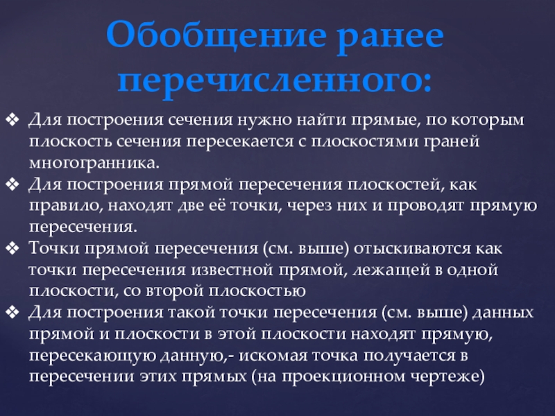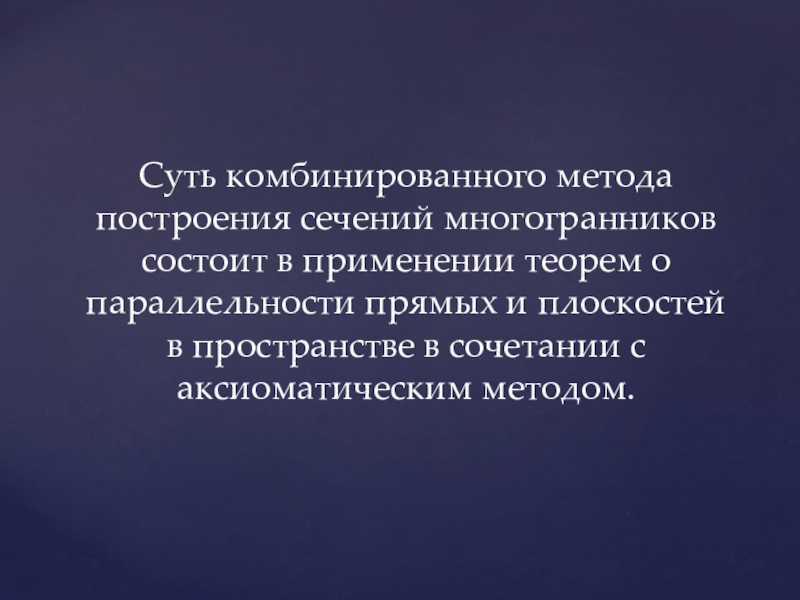 Слайд 40Суть комбинированного метода построения сечений многогранников состоит в применении теорем о