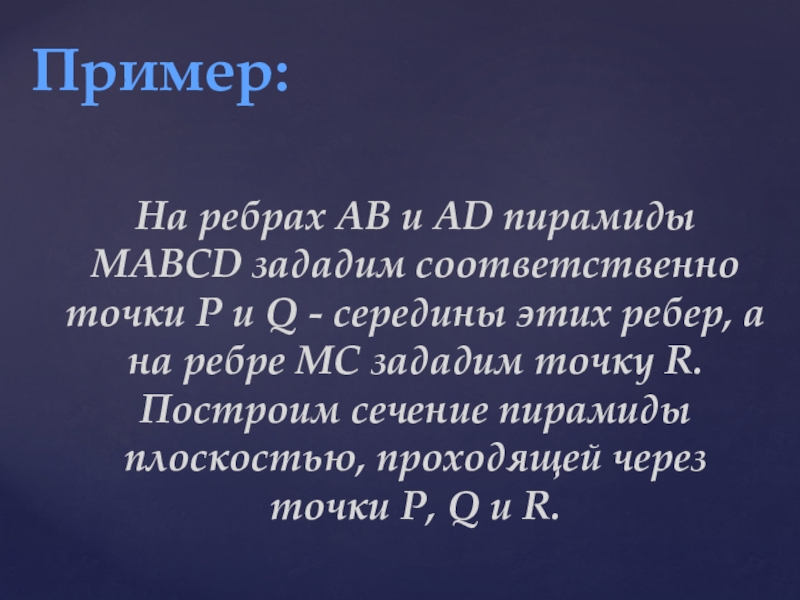 и Q - середины этих ребер, а на ребре MC зададим точку R. Построим сечение пирамиды плоскостью, проходящей через точки P, Q и R.