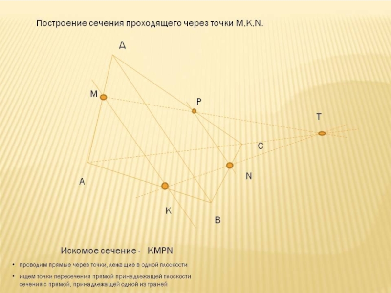 а) ищем точки пересечения прямой принадлежащей плоскости сечения с прямой, принадлежащей одной из граней (лежащие в одной плоскости);