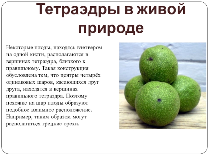 в вершинах тетраэдра, близкого к правильному. Такая конструкция обусловлена тем, что центры четырёх одинаковых шаров, касающихся друг друга, находятся в вершинах правильного тетраэдра. Поэтому похожие на шар плоды образуют подобное взаимное расположение. Например, таким образом могут располагаться грецкие орехи.