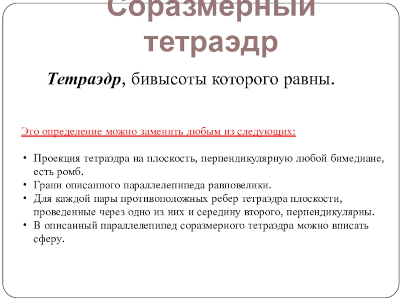 тетраэдра на плоскость, перпендикулярную любой бимедиане, есть ромб.