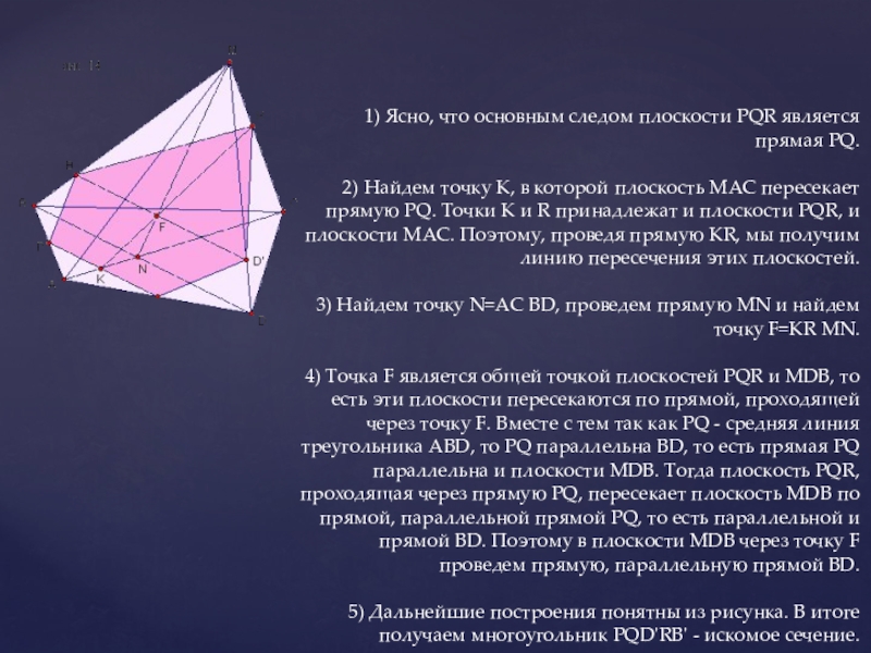Слайд 421) Ясно, что основным следом плоскости PQR является прямая PQ.