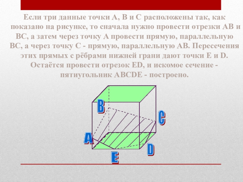 показано на рисунке, то сначала нужно провести отрезки AB и BC, а затем через точку A провести прямую, параллельную BC, а через точку C - прямую, параллельную AB. Пересечения этих прямых с рёбрами нижней грани дают точки E и D. Остаётся провести отрезок ED, и искомое сечение - пятиугольник ABCDE - построено.
