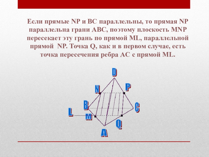 ABC, поэтому плоскость MNP пересекает эту грань по прямой ML, параллельной прямой NP. Точка Q, как и в первом случае, есть точка пересечения ребра AC с прямой ML.