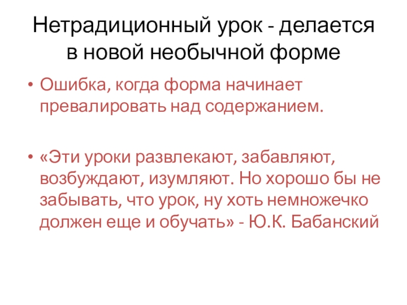 Нетрадиционный урок - делается в новой необычной формеОшибка, когда форма начинает превалировать над содержанием.«Эти уроки развлекают, забавляют,