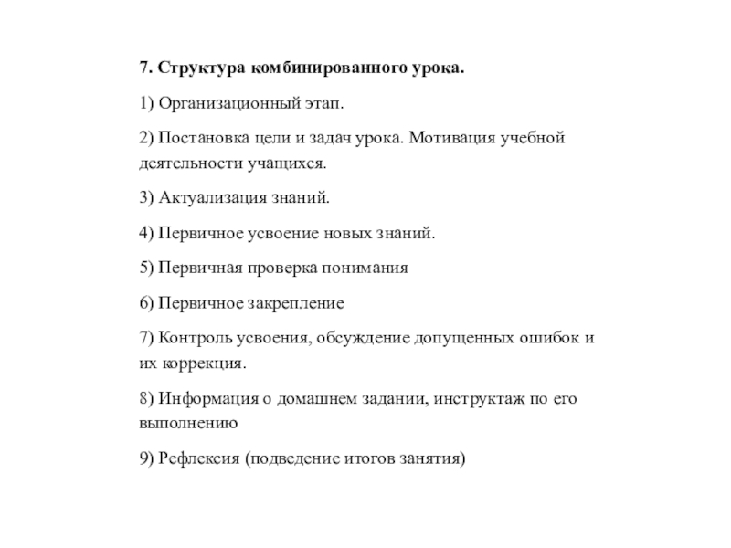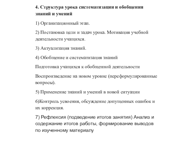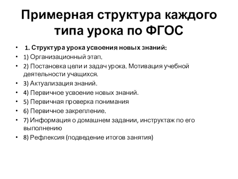 Примерная структура каждого типа урока по ФГОС 1. Структура урока усвоения новых знаний: 1) Организационный этап. 2)