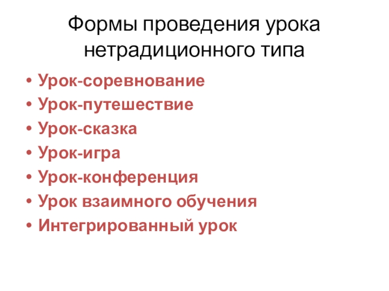 Формы проведения урока нетрадиционного типаУрок-соревнованиеУрок-путешествиеУрок-сказкаУрок-играУрок-конференцияУрок взаимного обученияИнтегрированный урок