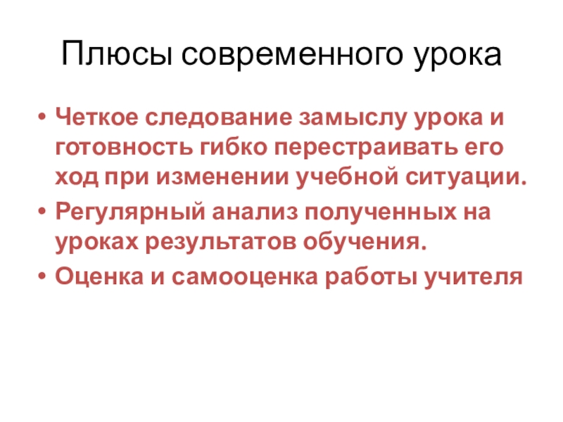 Плюсы современного урокаЧеткое следование замыслу урока и готовность гибко перестраивать его ход при изменении учебной ситуации.Регулярный анализ