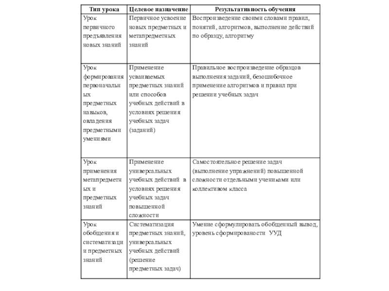 Тип урока Урок первичного предъявления новых знаний Урок формирования первоначальных предметных уменийУрок применения предметных уменийУрок обобщения и