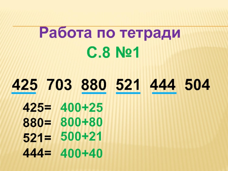 Работа по тетрадиС.8 №1425 703 880 521 444 504425=880=521=444=400+25800+80500+21400+40