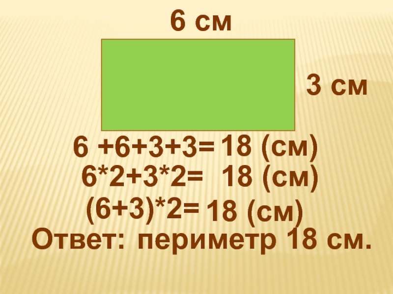 6 см3 см6 +6+3+3=18 (см)6*2+3*2=18 (см)(6+3)*2=18 (см)Ответ:периметр 18 см.