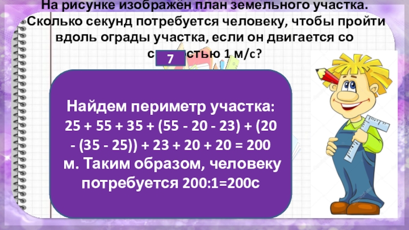 Найдем периметр участка: 25 + 55 + 35 + (55 - 20 - 23) + (20 - (35 - 25)) + 23 + 20 + 20 = 200 м. Таким образом, человеку потребуется 200:1=200с