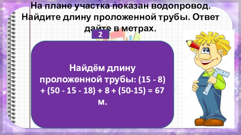 Найдём длину проложенной трубы: (15 - 8) + (50 - 15 - 18) + 8 + (50-15) = 67 м.