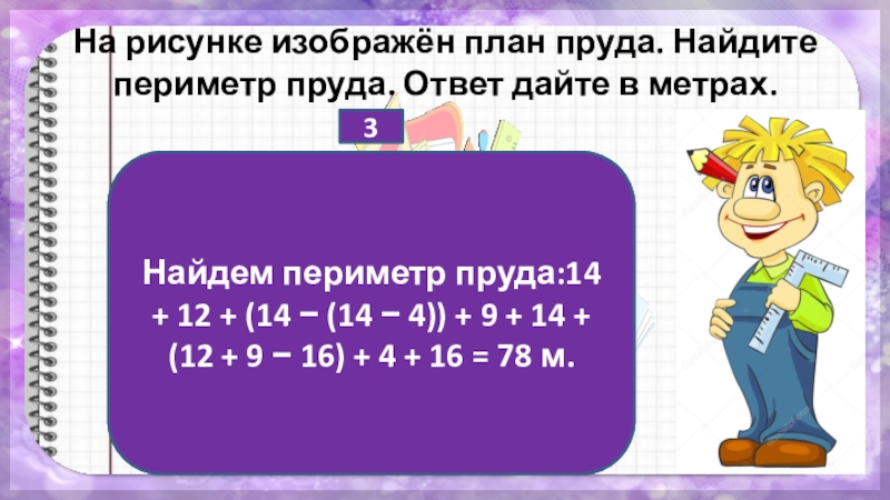 Найдем периметр пруда:14 + 12 + (14 − (14 − 4)) + 9 + 14 + (12 + 9 − 16) + 4 + 16 = 78 м.
