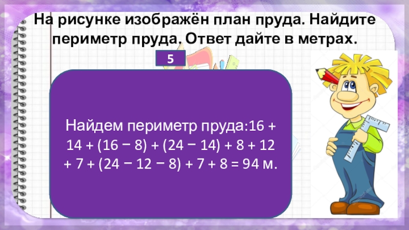 Найдем периметр пруда:16 + 14 + (16 − 8) + (24 − 14) + 8 + 12 + 7 + (24 − 12 − 8) + 7 + 8 = 94 м.