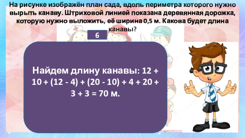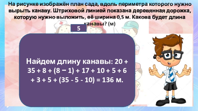 Найдем длину канавы: 20 + 35 + 8 + (8 − 1) + 17 + 10 + 5 + 6 + 3 + 5 + (35 - 5 - 10) = 136 м.