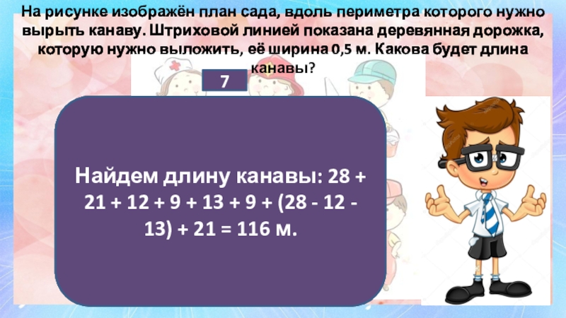 Найдем длину канавы: 28 + 21 + 12 + 9 + 13 + 9 + (28 - 12 - 13) + 21 = 116 м.