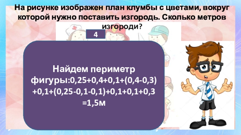 Найдем периметр фигуры:0,25+0,4+0,1+(0,4-0,3)+0,1+(0,25-0,1-0,1)+0,1+0,1+0,3=1,5м