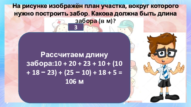 Рассчитаем длину забора:10 + 20 + 23 + 10 + (10 + 18 − 23) + (25 − 10) + 18 + 5 = 106 м