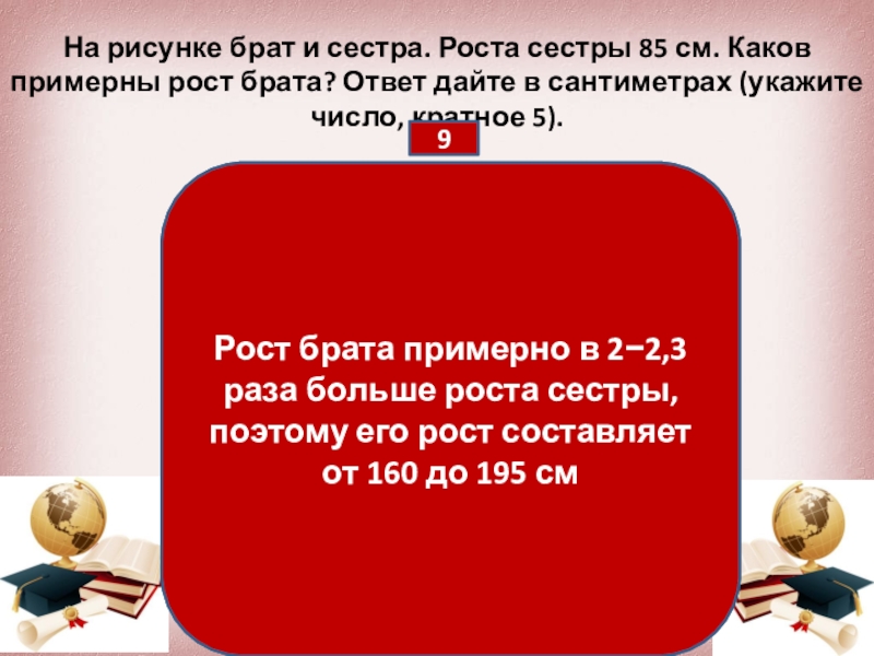 Рост брата примерно в 2−2,3 раза больше роста сестры, поэтому его рост составляет от 160 до 195 см