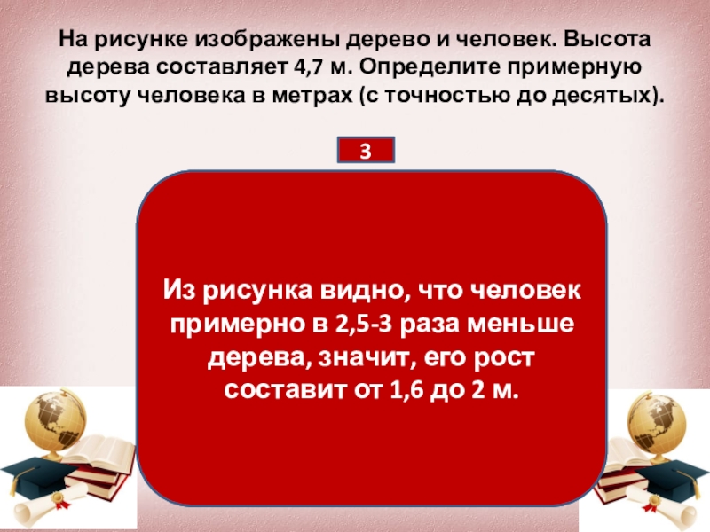 Из рисунка видно, что человек примерно в 2,5-3 раза меньше дерева, значит, его рост составит от 1,6 до 2 м.