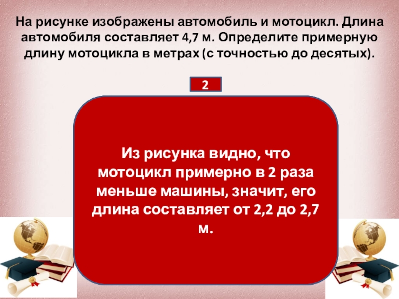 Из рисунка видно, что мотоцикл примерно в 2 раза меньше машины, значит, его длина составляет от 2,2 до 2,7 м.