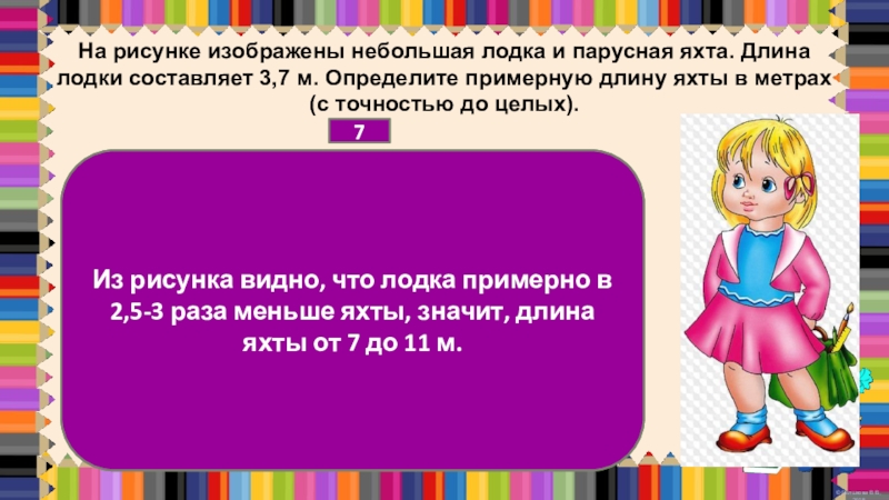 Из рисунка видно, что лодка примерно в 2,5-3 раза меньше яхты, значит, длина яхты от 7 до 11 м.