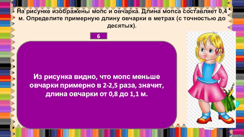 Из рисунка видно, что мопс меньше овчарки примерно в 2-2,5 раза, значит, длина овчарки от 0,8 до 1,1 м.