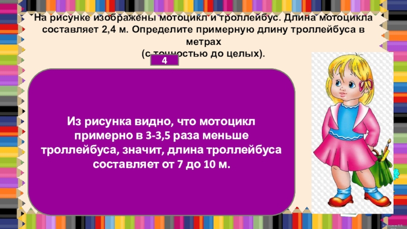 Из рисунка видно, что мотоцикл примерно в 3-3,5 раза меньше троллейбуса, значит, длина троллейбуса составляет от 7 до 10 м.
