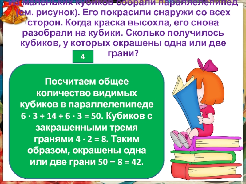 Посчитаем общее количество видимых кубиков в параллелепипеде 6 · 3 + 14 + 6 · 3 = 50. Кубиков с закрашенными тремя гранями 4 · 2 = 8. Таким образом, окрашены одна или две грани 50 − 8 = 42.