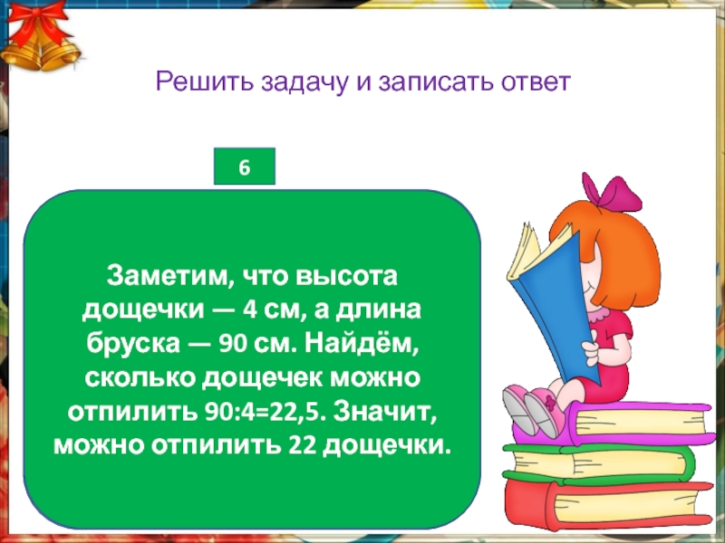 Заметим, что высота дощечки — 4 см, а длина бруска — 90 см. Найдём, сколько дощечек можно отпилить 90:4=22,5. Значит, можно отпилить 22 дощечки.