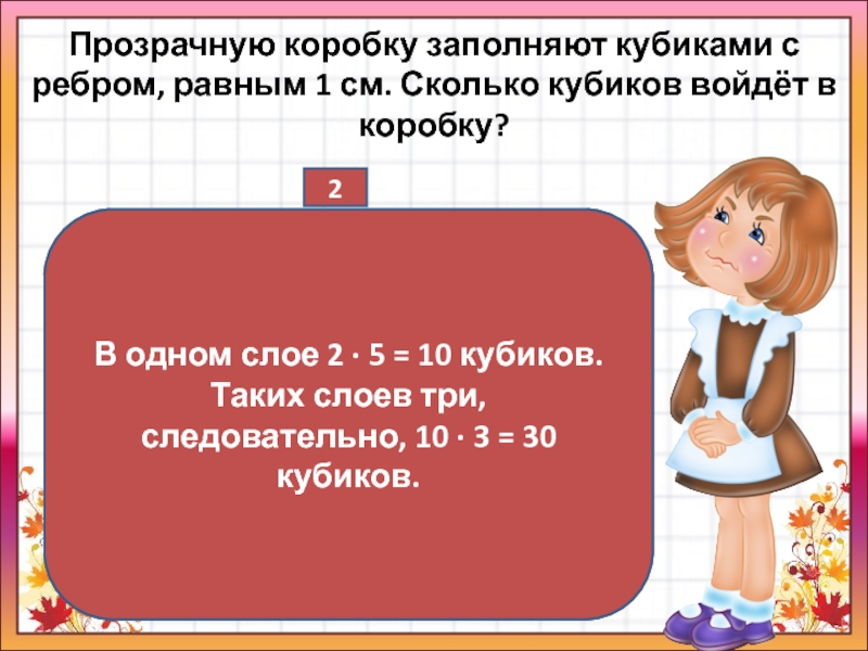 В одном слое 2 · 5 = 10 кубиков. Таких слоев три, следовательно, 10 · 3 = 30 кубиков.