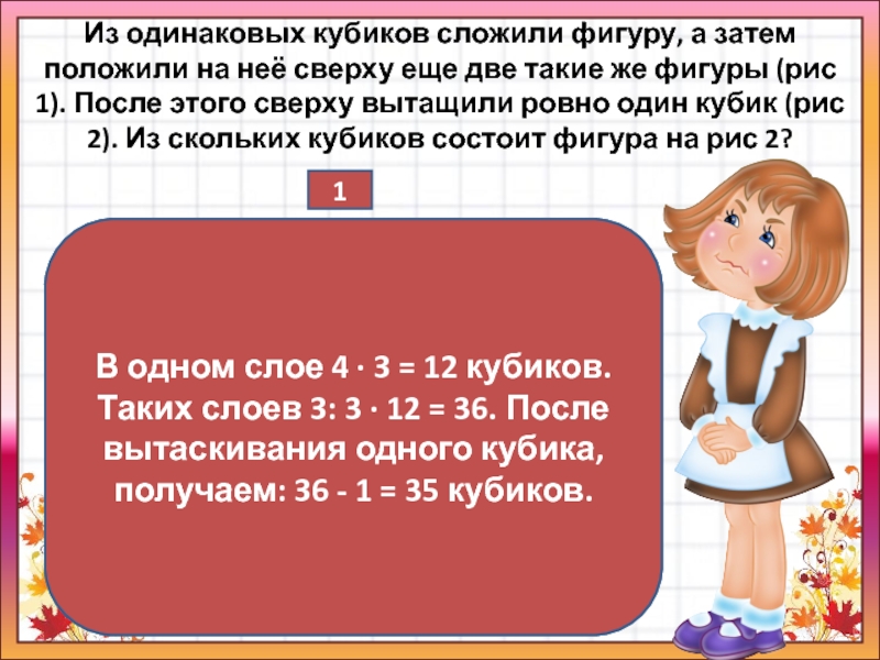 В одном слое 4 · 3 = 12 кубиков. Таких слоев 3: 3 · 12 = 36. После вытаскивания одного кубика, получаем: 36 - 1 = 35 кубиков.