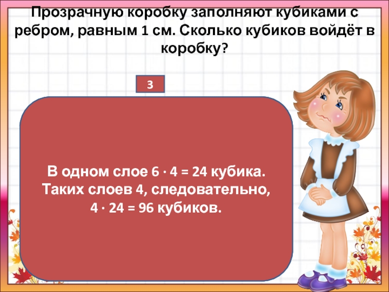В одном слое 6 · 4 = 24 кубика. Таких слоев 4, следовательно, 4 · 24 = 96 кубиков.