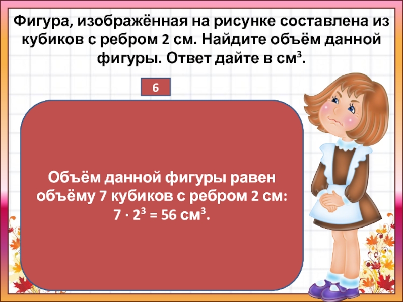 Объём данной фигуры равен объёму 7 кубиков с ребром 2 см: 7 · 23 = 56 см3.