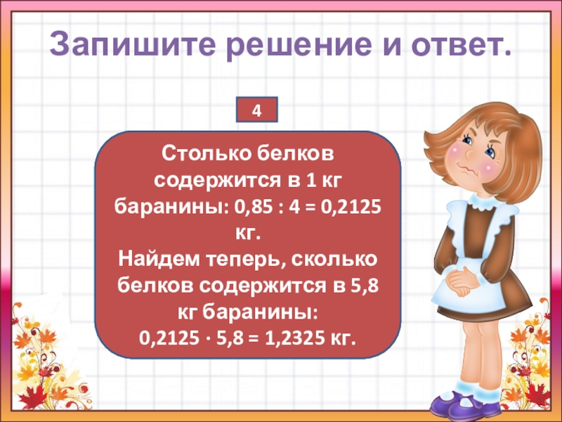 Столько белков содержится в 1 кг баранины: 0,85 : 4 = 0,2125кг.