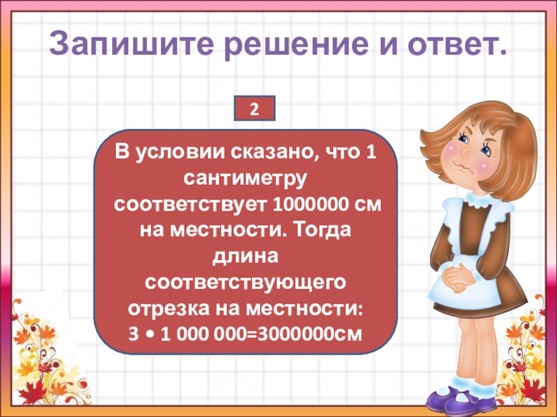 В условии сказано, что 1 сантиметру соответствует 1000000 см на местности. Тогда длина соответствующего отрезка на местности: 3 • 1 000 000=3000000см