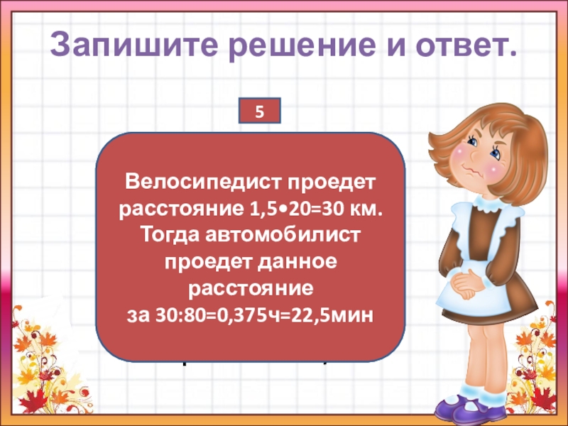 Велосипедист проедет расстояние 1,5•20=30 км. Тогда автомобилист проедет данное расстояние за 30:80=0,375ч=22,5мин