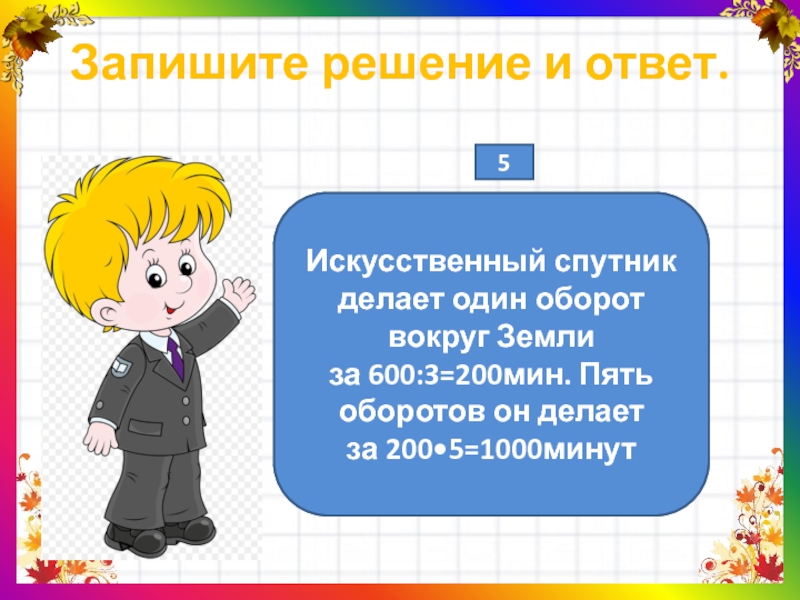 Искусственный спутник делает один оборот вокруг Земли за 600:3=200мин. Пять оборотов он делает за 200•5=1000минут