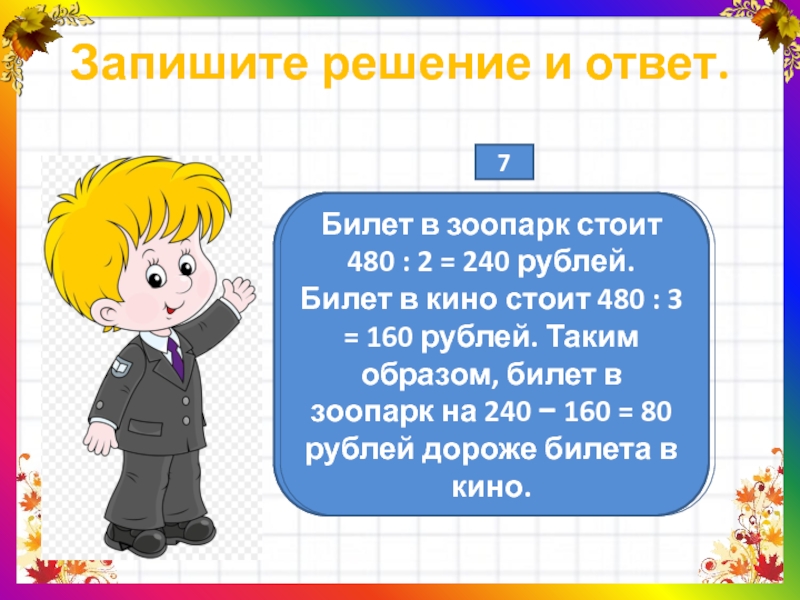 Билет в зоопарк стоит 480 : 2 = 240 рублей. Билет в кино стоит 480 : 3 = 160 рублей. Таким образом, билет в зоопарк на 240 − 160 = 80 рублей дороже билета в кино.