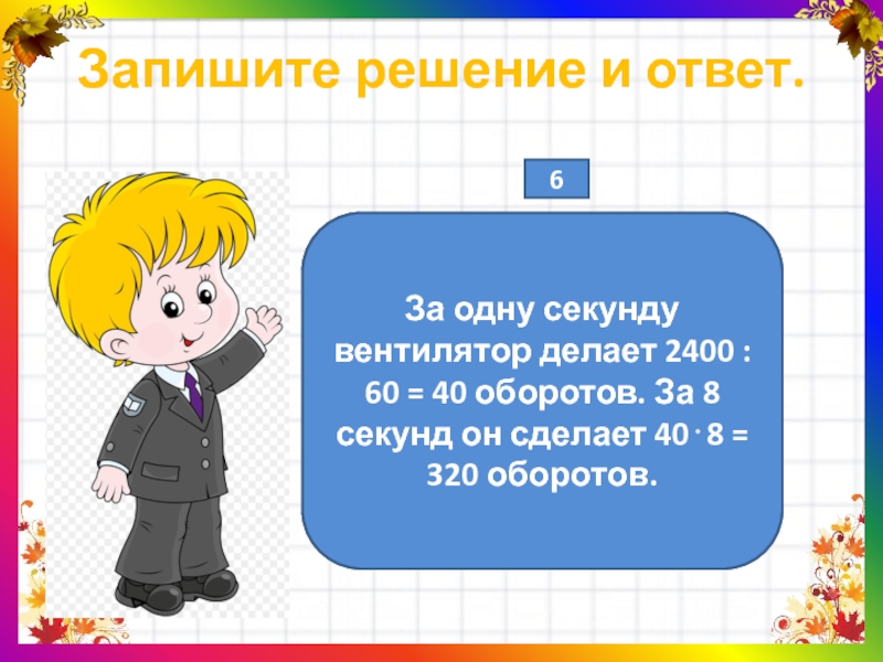 За одну секунду вентилятор делает 2400 : 60 = 40 оборотов. За 8 секунд он сделает 40⋅8 = 320 оборотов.
