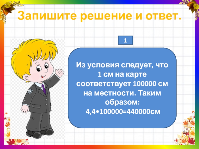 Из условия следует, что 1 см на карте соответствует 100000 см на местности. Таким образом: