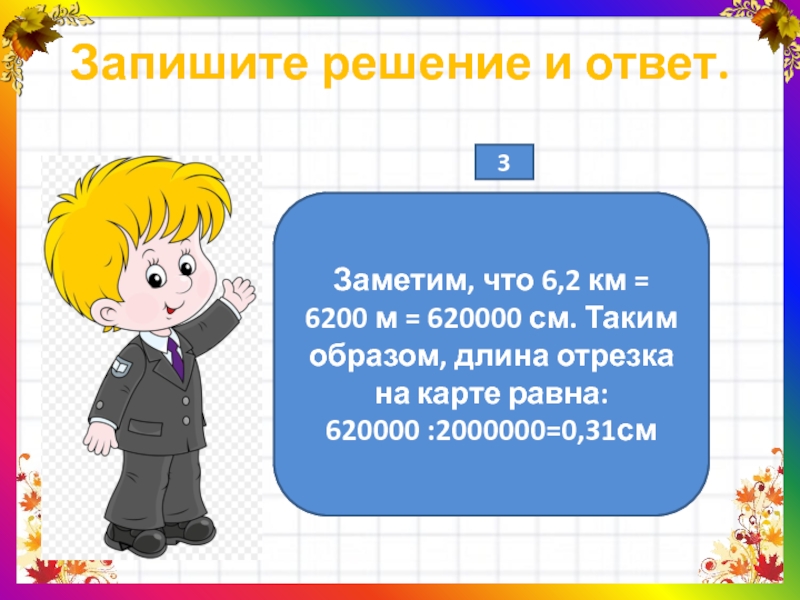 6200 м = 620000 см. Таким образом, длина отрезка на карте равна: 620000 :2000000=0,31см