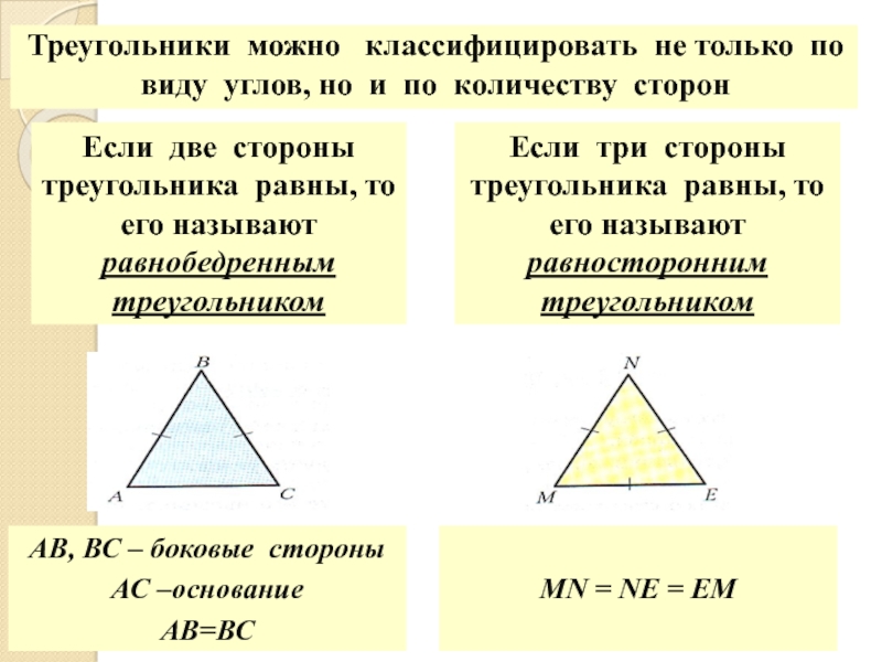 Если две стороны треугольника равны, то его называют равнобедренным треугольником