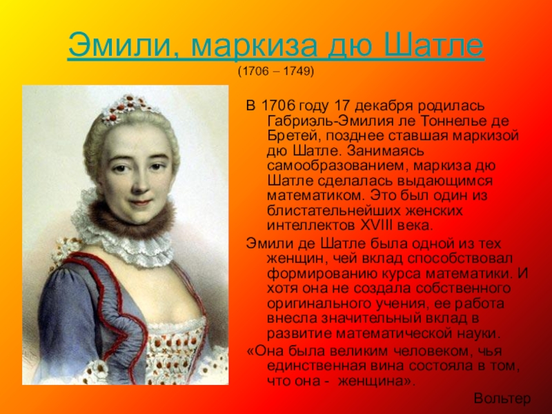 Эмили де Шатле была одной из тех женщин, чей вклад способствовал формированию курса математики. И хотя она не создала собственного оригинального учения, ее работа внесла значительный вклад в развитие математической науки.