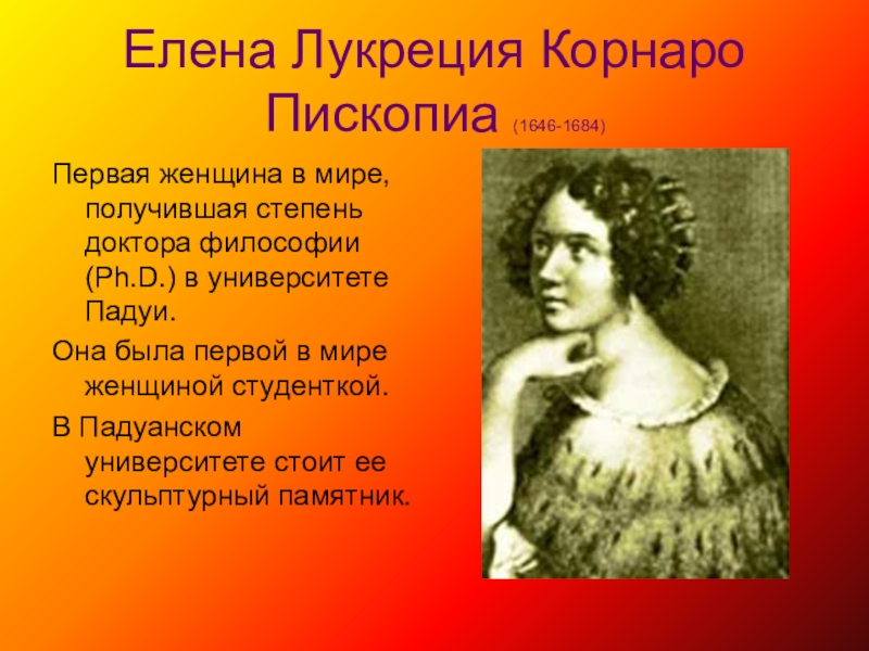 Слайд 10Елена Лукреция Корнаро Пископиа (1646-1684)