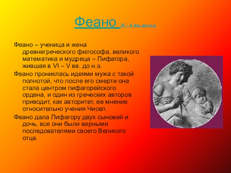 Феано дала Пифагору двух сыновей и дочь, все они были верными последователями своего Великого отца.