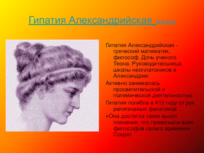 Гипатия Александрийская - греческий математик, философ. Дочь ученого